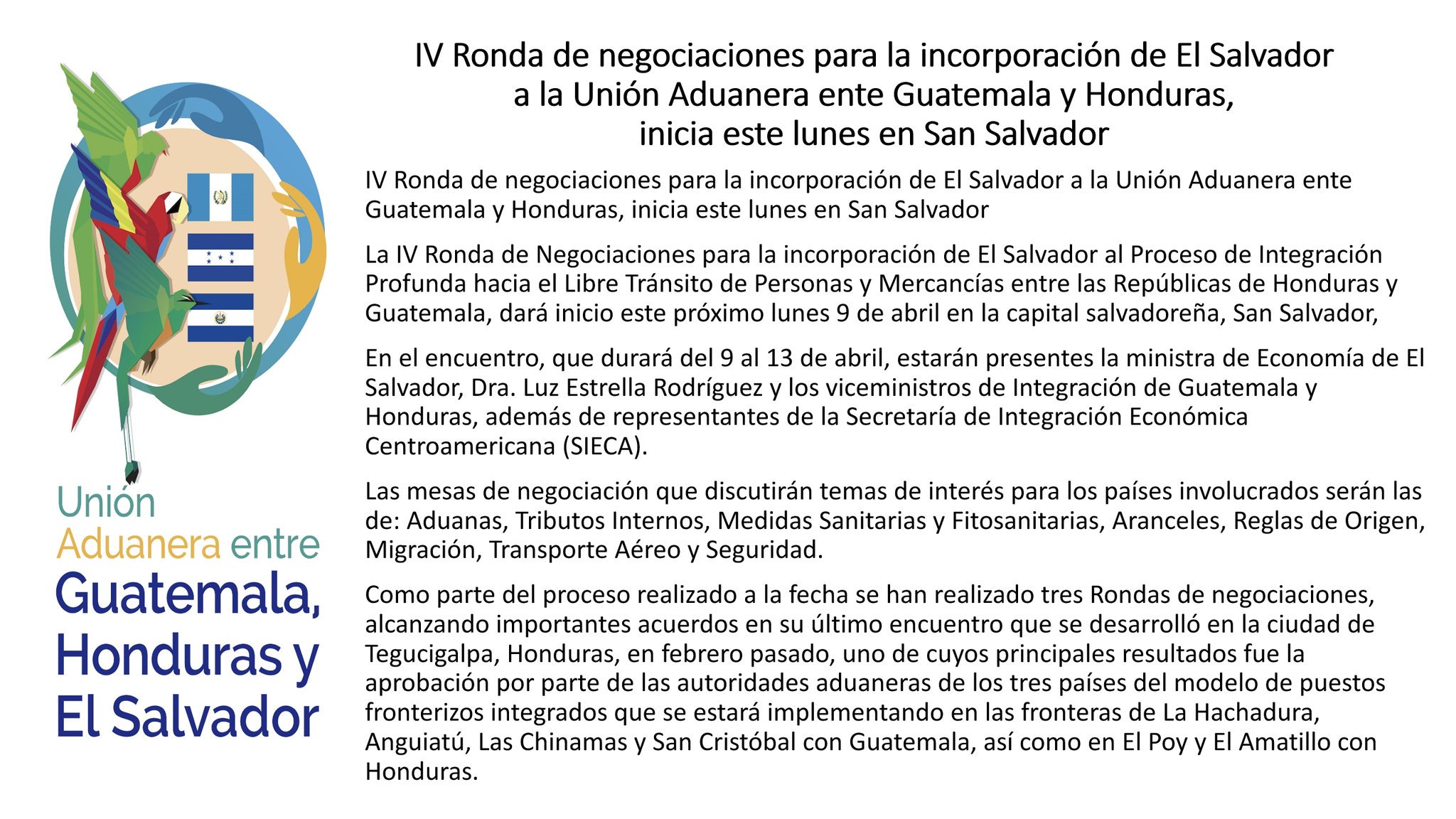 La última ronda de negociaciones se realizó en febrero pasado en Honduras, donde se aprobó “el modelo de puestos fronterizos integrados que se estará implementando en las fronteras de La Hachadura, Anguiatú, Las Chinamas y San Cristóbal con Guatemala, así como en El Poy y El Amatillo con Honduras”.