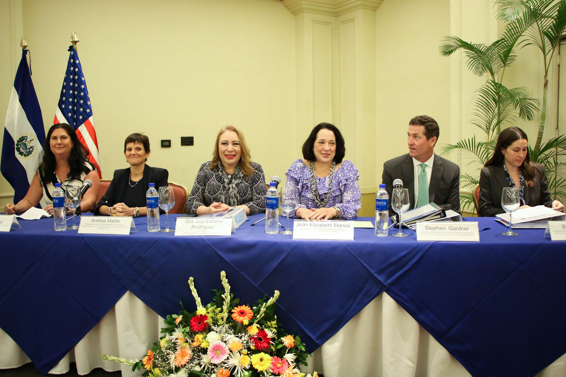 El evento también estuvo presidido por la Embajadora de los Estados Unidos en El Salvador, Jean Manes; Stephen Gardner Y Siobhan Siaca, el Consejero Principal y la Abogada Asesora de la Oficina del Programa para el Desarrollo de Derecho Comercial del Departamento de Comercio, respectivamente.