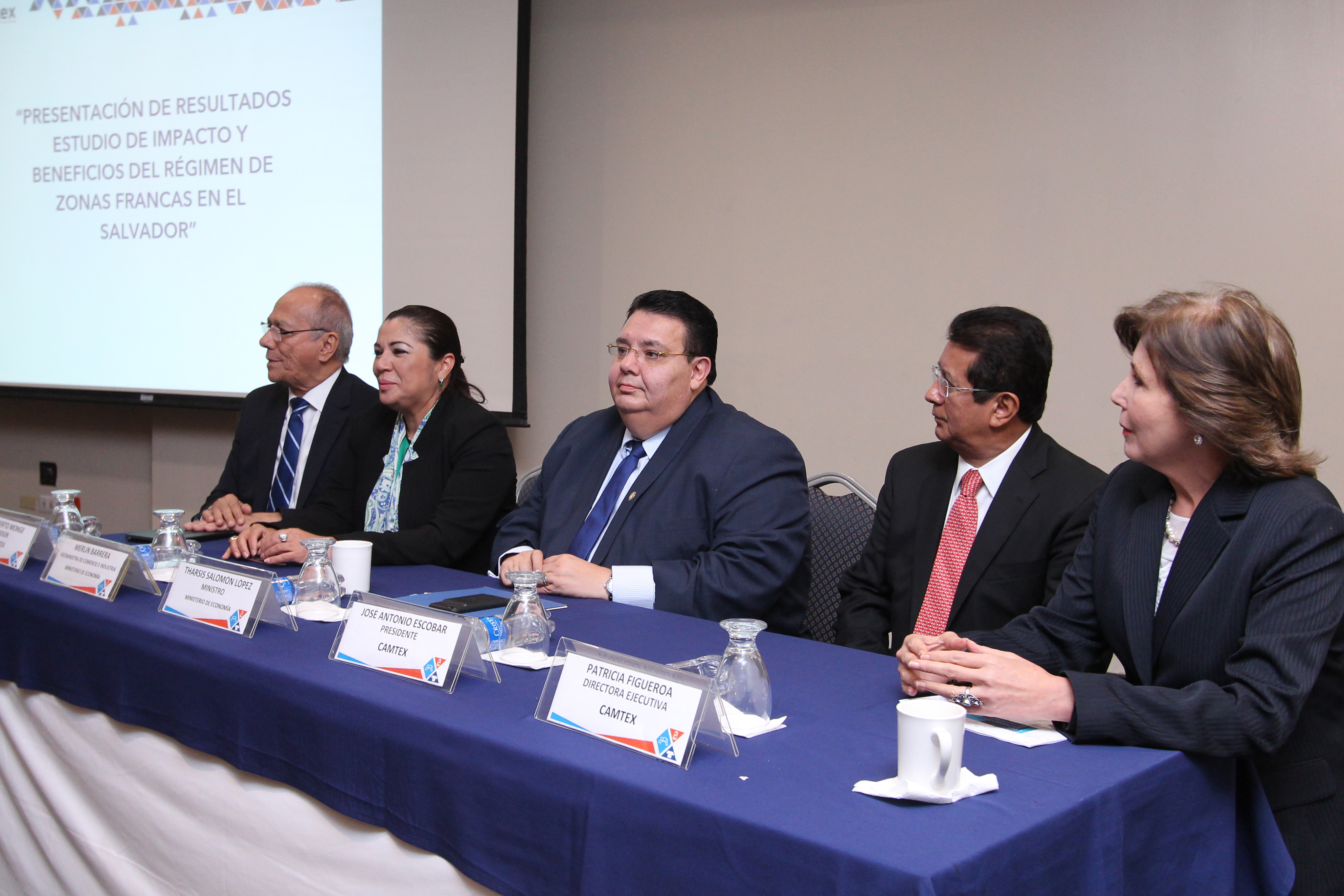 El ministro de Economía, Tharsis Salomón López y la viceministra de Comercio e Industria, Merlin Barrera participaron en la presentación de resultados estudio de impacto y beneficios régimen zonas francas en El Salvador, realizado por la Cámara de la Industria Textil, Confección y Zonas Francas en El Salvador (CAMTEX).