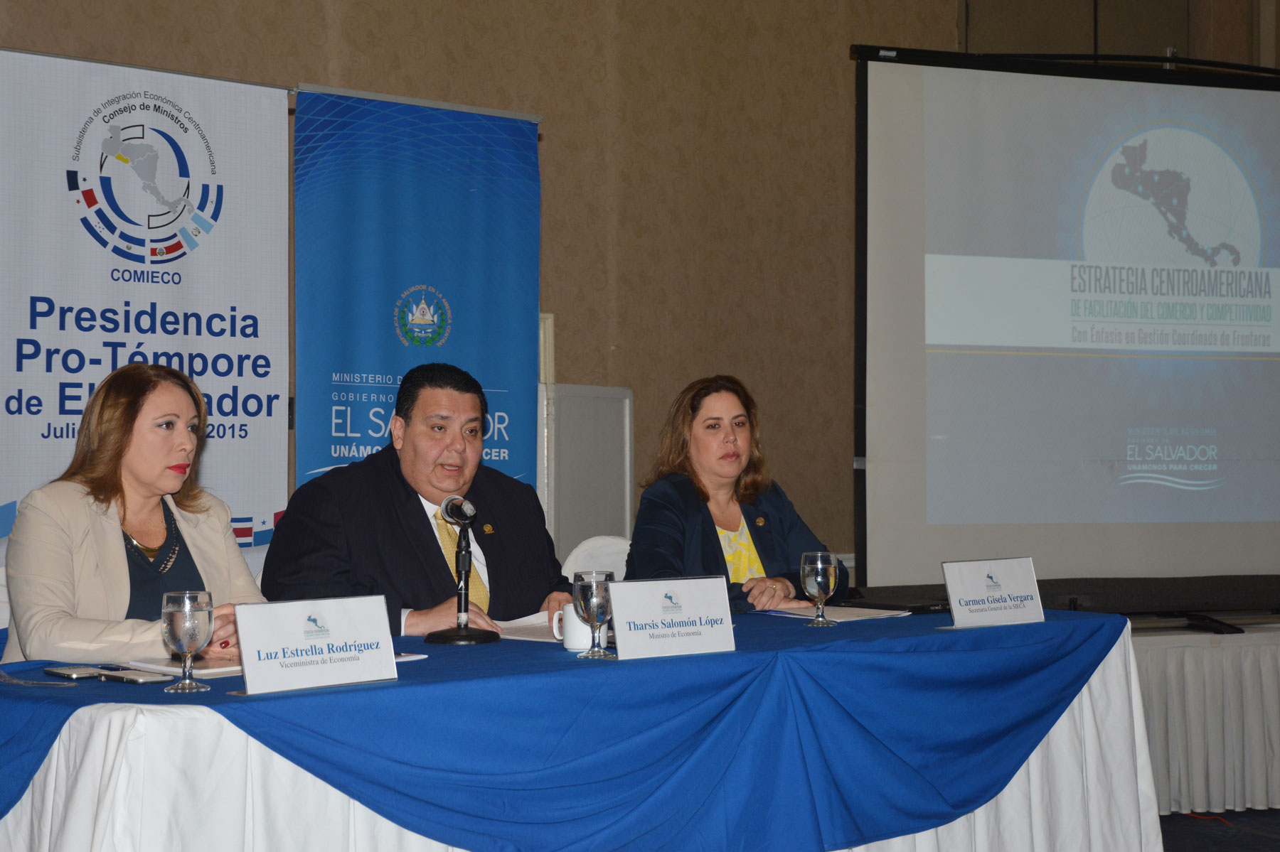 El Ministro de Economía, Tharsis Salomón López, acompañado de la Viceministra de Economía, Luz Estrella Rodríguez, presentó este viernes a altos funcionarios de gobierno y a representantes del sector privado y de organismos internacionales, la “Estrategia Centroamericana de Facilitación del Comercio y Competitividad con énfasis en Gestión Coordinada de Fronteras”, la cual fue aprobada por el Consejo de Ministros de Integración Económica Centroamericana (COMIECO), el pasado 22 de octubre del presente año.